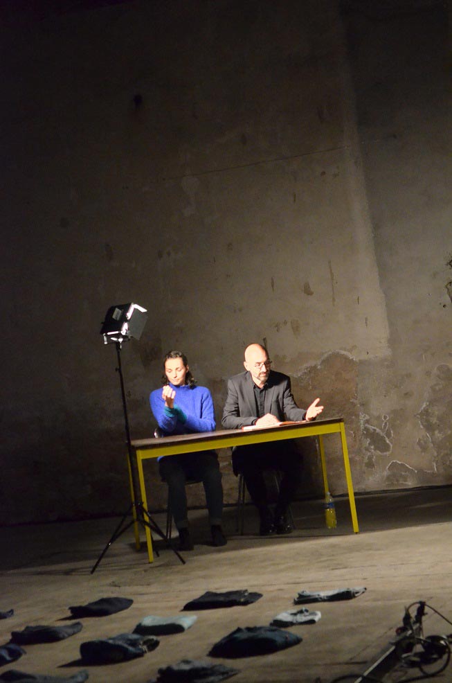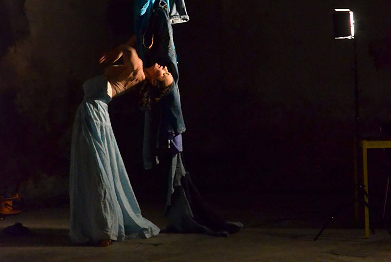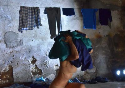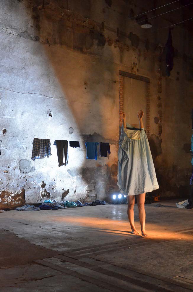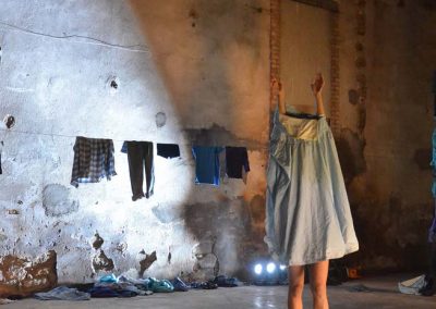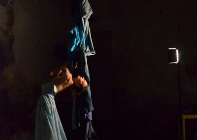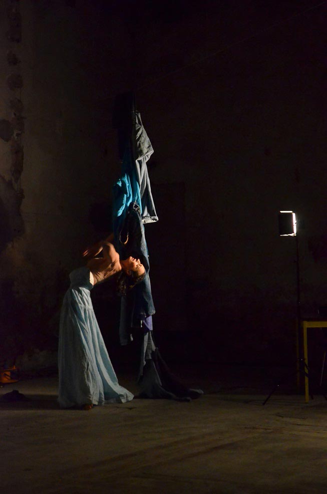 En écho au travail de Leïla Thiriet, au passé industriel des lieux investis par la danse, la performance cherche à mettre à jour les liens que le textile établit entre les individus, et à rendre sensibles les enjeux économiques, écologiques, humains qui sous-tendent nos habitudes de consommation. Par le corps, qui évolue au milieu des habits, le chant, composé et tissé en direct au moyen d’un looper, le texte, qui fait une place à des témoignages d’ouvriers collectés sur place, il y est donc question de fibre, de peau, et de lien.