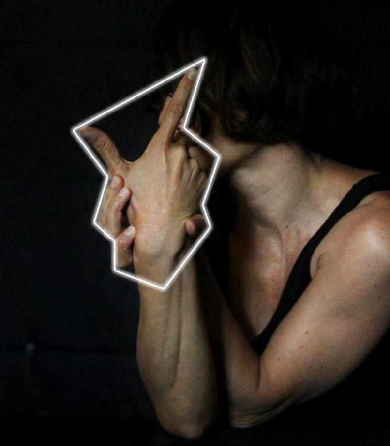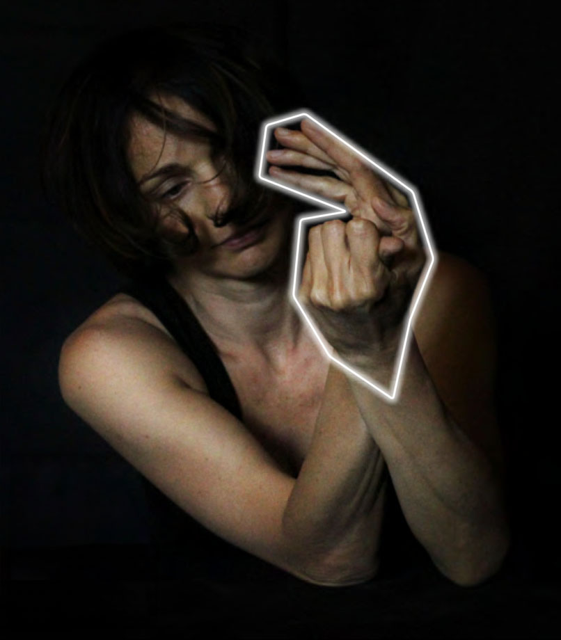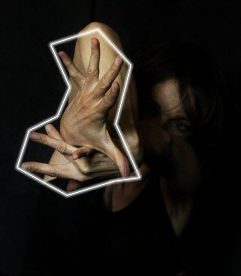 Par la lumière, le scénographe isole les mains de la danseuse. Des danseurs amateurs dupliquent le geste de différentes façons, en utilisant différentes ressources scénographiques.